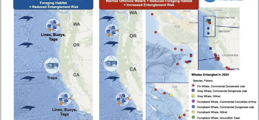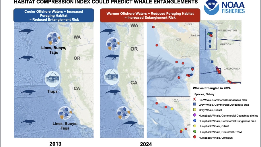 NOAA Fisheries scientists have found telltale changes in cool, highly productive water upwelling along the West Coast — changes that can provide “an early warning system” signaling greater risk of humpback whales getting entangled in fishing gear.